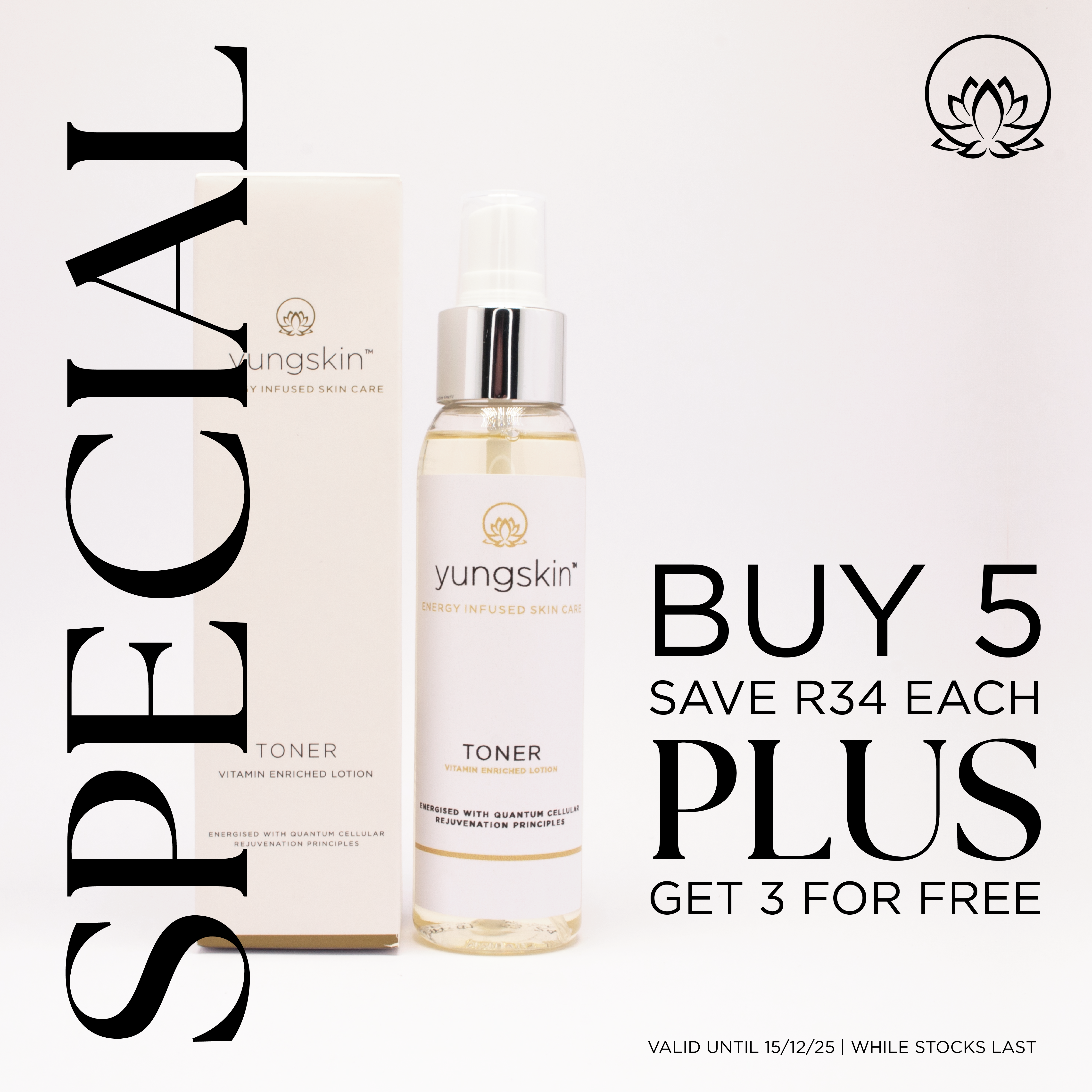 Refresh and refine your skin with our gentle Toner (100 ml), usually R139 per bottle. For a limited time, buy 5 at R105 each and get 3 free, giving you a total of 8 toners for R525 — just R65.63 per unit.